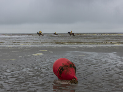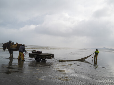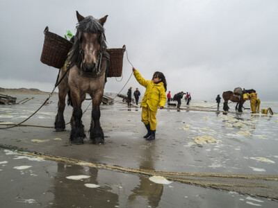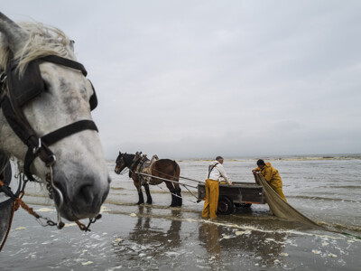 From the shore, the team of paardenvissers take on the appearance of a slow-motion film. The horses, often wading in water up to their stomachs, move slowly through the water so as not to be affected by the current or waves. The fishermen lead them parallel to the shore, because the small grey shrimp they are catching live in longitudinal colonies.