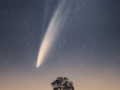 Na snímku je kometa C3/2020 Neowise spolu s osamělým stromem na vršku kopce na poli v CHKO Křivoklátsko. Fotografie byla pořízena během svitu couvajícího Měsíce, ale přesto díky velmi čistému vzduchu a minimu světelného znečištění jsem byl schopen zachytit detaily prachového ale i namodralého iontového ohonu