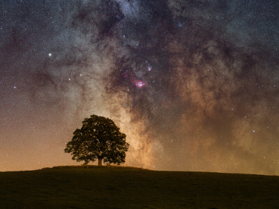 Snímek zachycuje Votický javor, patrně nejznámější a nejfotografovanější strom v Česku, spolu s centrem naší Galaxie. Kromě tmavých prachových mlhovin vyniká ve snímku emisní mlhovina Laguna a nad ní menší mlhovina Trifid.