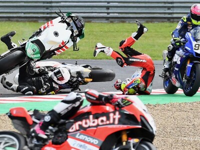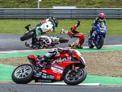 Za jakých okolností byla fotografie pořízena se dozvíte přímo od autora: „Mistrovství světa superbiků mělo na mosteckém autodromu premiéru, a já zrovna tak fotografoval závodní motocykly poprvé. K dramatu zobrazeném na snímku došlo v nedělním závodě 8. srpna 2021 v záludné šikaně krátce po startu. Původně jsem chtěl fotit celou skupinu jezdců s diváky v pozadí, ale když jsem si všimnul trablů za vedoucími závodníky, rychle jsem přeostřil a zaměřil se na nešťastníky a jejich karambol. Do kompozice fotografie mi nahrál i ujíždějící jezdec v popředí.“