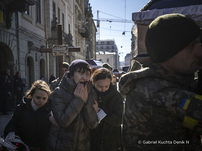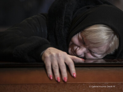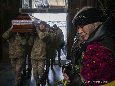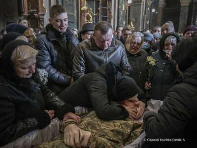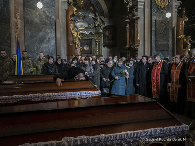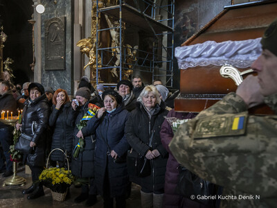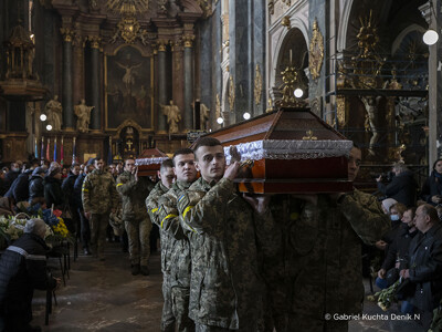 „Zkraje třetího týdne války se Deník N vrátil do západoukrajinského Lvova, kam přímé útoky ruských vojsk tou dobou ještě nedosáhly. Blízkost bojů byla víc než kde jinde zjevná v kostele Nejsvětějších apoštolů Petra a Pavla. Andrij, 40, Taras, 26 a Dmytro, 59. To jsou křestní jména a věk vojáků, které tu ten den pohřbívali. Všichni padli v bojích hned na začátku války. Na poslední rozloučení s muži, kteří za obranu Ukrajiny položili život, bylo v chrámu plno.