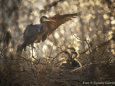 „Kolonie volně hnízdících volavek v Zoo Praha je mezi wildlife fotografy pověstná. Galerie se hemží fotkami místních volavek, protože podmínky pro jejich fotografování jsou zde jedinečné. Právě proto je potřeba určitá dávka štěstí, trpělivosti a nápad, aby fotka něčím zaujala. Téměř při každé návštěvě se na cestě skalním svahem zvaném Zakázanka na chvíli zastavím. Tentokrát to nebylo jiné, chtěla jsem jen synovi ukázat "ptáčky". Když jsem dorazila na místo a on na břiše v nosítku usnul, na foťák přeci jen došlo. Tentokrát mě zaujal odraz slunce ve Vltavě. Vybrala jsem si hnízdo s hezkým pozadím, kde byla mláďata sama a čekala na přílet rodičů, kdy se dá zachytit předávání potravy, nebo podobná akce,“ popisuje vznik fotografie Zuzana Gabrielová.