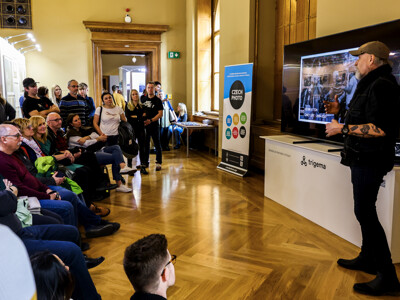Manažer soutěže CPP Dan Materna společně s předsedou poroty Petrem Mlchem provázeli zájemce výstavou a komentovali jednotlivé práce.