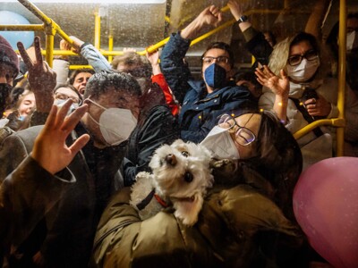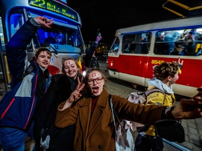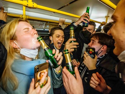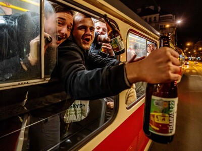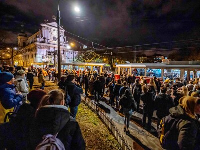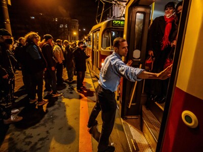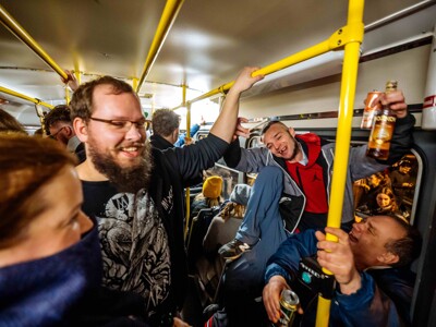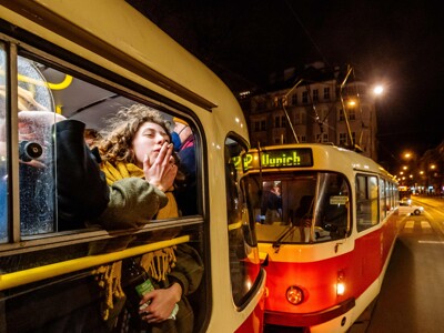 Já měl štěstí, nastupoval jsem preventivně už ve Vršovicích s dostatečným předstihem. Říkal jsem si, že by mi to mohlo vzhledem k jízdnímu řádu vyjít a udělám nějakou pěknou fotku třeba s pozadím Pražského hradu, když budeme míjet Národní divadlo. No skončil jsem na Karlově náměstí, kde souprava kvůli náporu juchajících cestujících zkolabovala. Než dispečink vše vyřešil a poslal ji do depa, rozjel se v ní a přilehlé zastávce bezstarostný mejdan a oslava života. Za dva dny na to napadlo Rusko Ukrajinu…,“ popisuje vznik série Petr Topič.