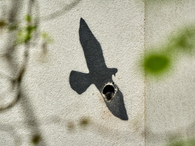 Že siluety „dravců“ k odplašení nevítaných ptačích návštěvníků lidských sídel nefungují, je všeobecně známo (všem, kromě těch, kdo je naivně používají). Mimochodem, siluety většinou ani „dravce“ nezobrazují. „Výraz“ této olomoucké kavky ostatně mluví sám za sebe… Ta vyhnízdila v dutině přímo nad „odstrašující“ siluetou, jak je patrné z typické pobytové stopy – omítky ušmudlané pod vstupem do dutiny od ocasních per. Dutinu jsem ořízl, abych získal minimalističtější a efektivnější kompozici.