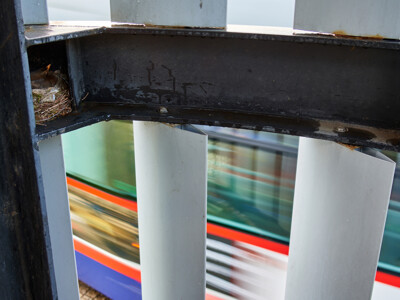 Ztráta plachosti městských zvířat nikoho nepřekvapí. Ale i po více než deseti letech studia chování městských kosů mě extrémní výběr hnízdiště této kosí samice poněkud šokoval: z jedné strany každých pár minut projížděla tramvaj sotva metr od hnízda, ze strany druhé vedlo na vzdálenost ještě kratší rušné schodiště (odkud jsem fotil). Dynamičtější prostředí si lze představit těžko – což jsem se pokusil zdůraznit delším expozičním časem ve chvíli, kdy kosí domov míjela další olomoucká tramvaj. Snůška byla úspěšně vyvedena.