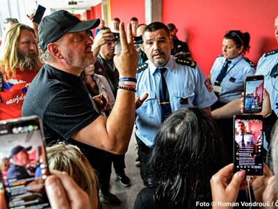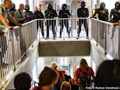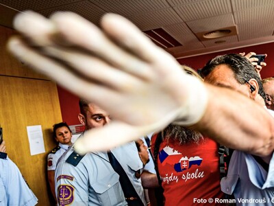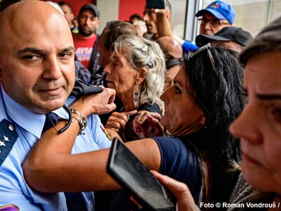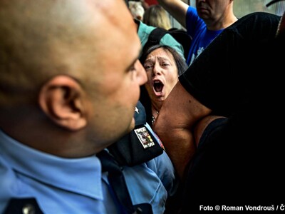 Porotu soutěže Foto měsíce v těsném hlasování nejvíce zaujaly snímky Romana Vondrouše z protestu a následného policejní zásahu v budově soudu. Desítky lidí přišly 26. července 2023 k Obvodnímu soudu pro Prahu 8 podpořit Patrika Tušla a Tomáše Čermáka kvůli jejich pronásledování a obtěžování šéfa České lékařské komory Milana Kubka v době koronavirové pandemie. Roman Vondrouš k fotografování říká: