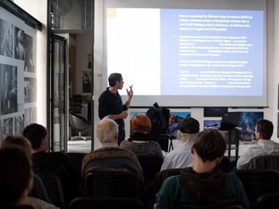 Jako první hovořil o krizi Rohingů Martin Trabalík – český fotograf a kameraman. Ve své práci se zabývá sociálními a humanitárními tématy. Martin většinou spolupracuje se španělskou reportérkou Ariadnou Garciou Chas, se kterou tvoří dokumentární duo Drowned in Venice. Ve své prezentaci představil vývoj uprchlické krize muslimského kmene Rohingů, kteří utíkali z Barmy do Bangladéše.